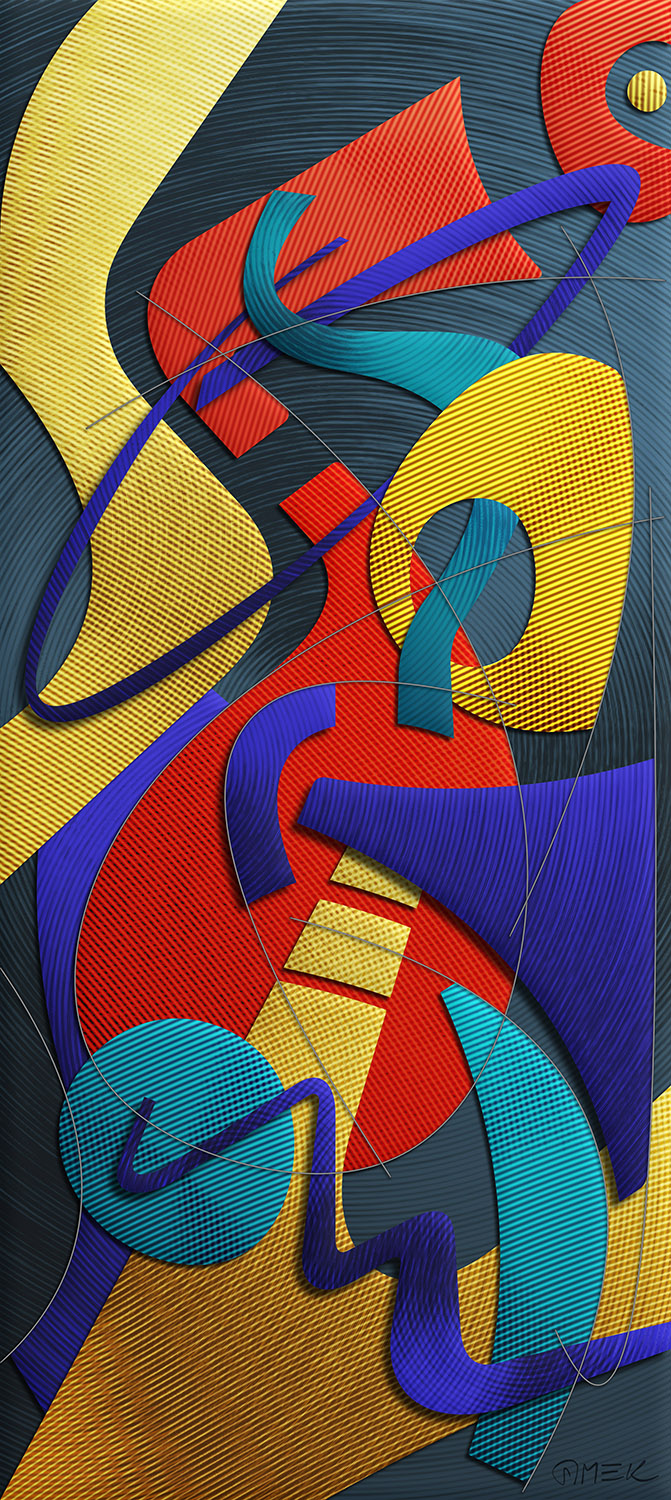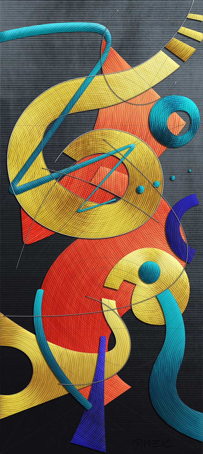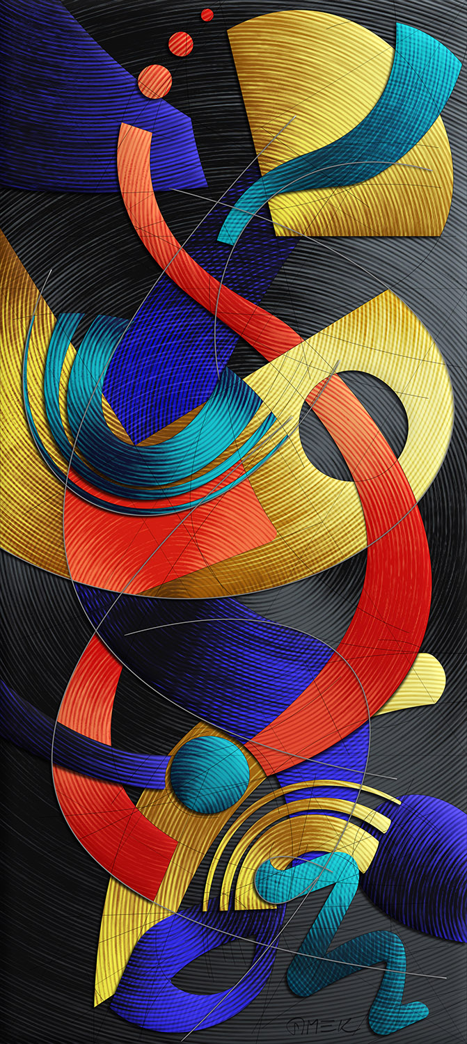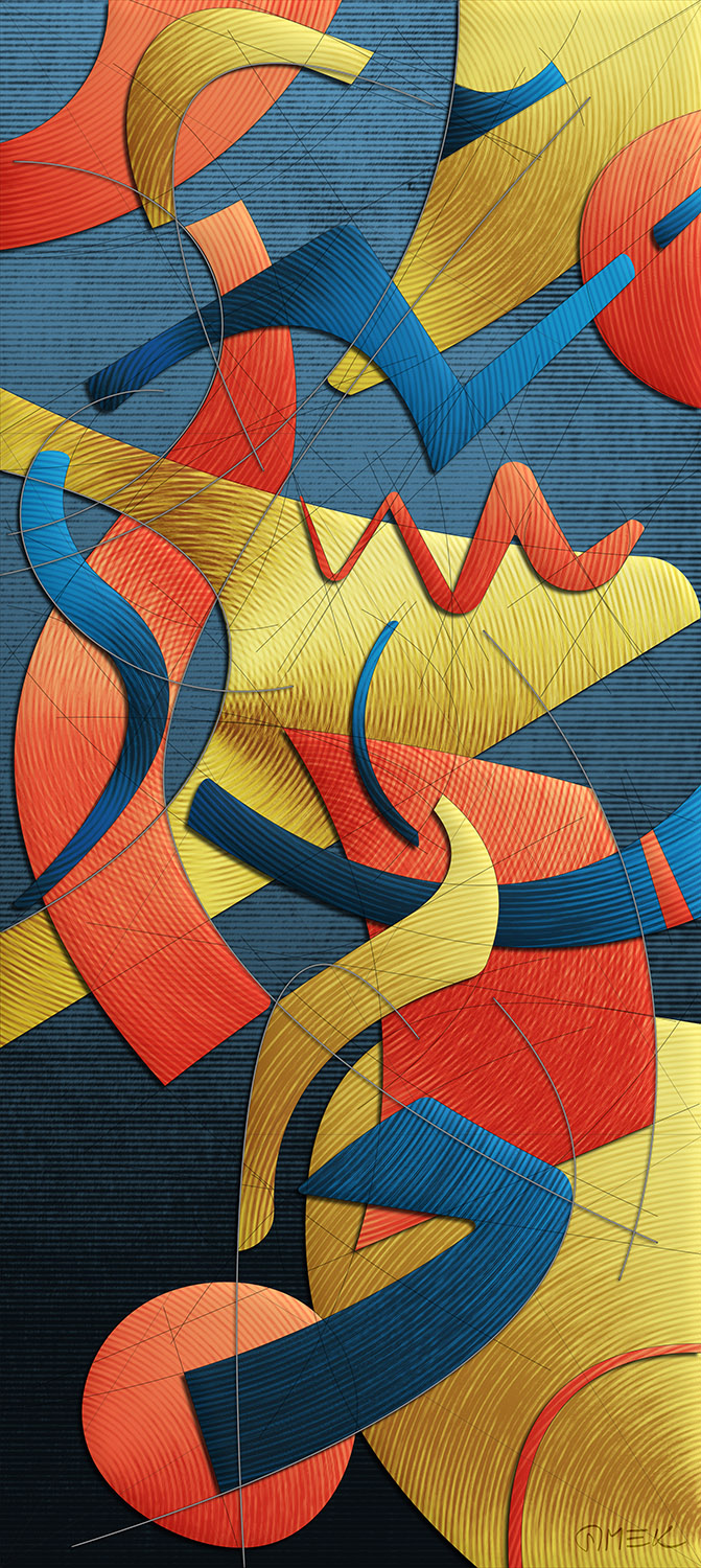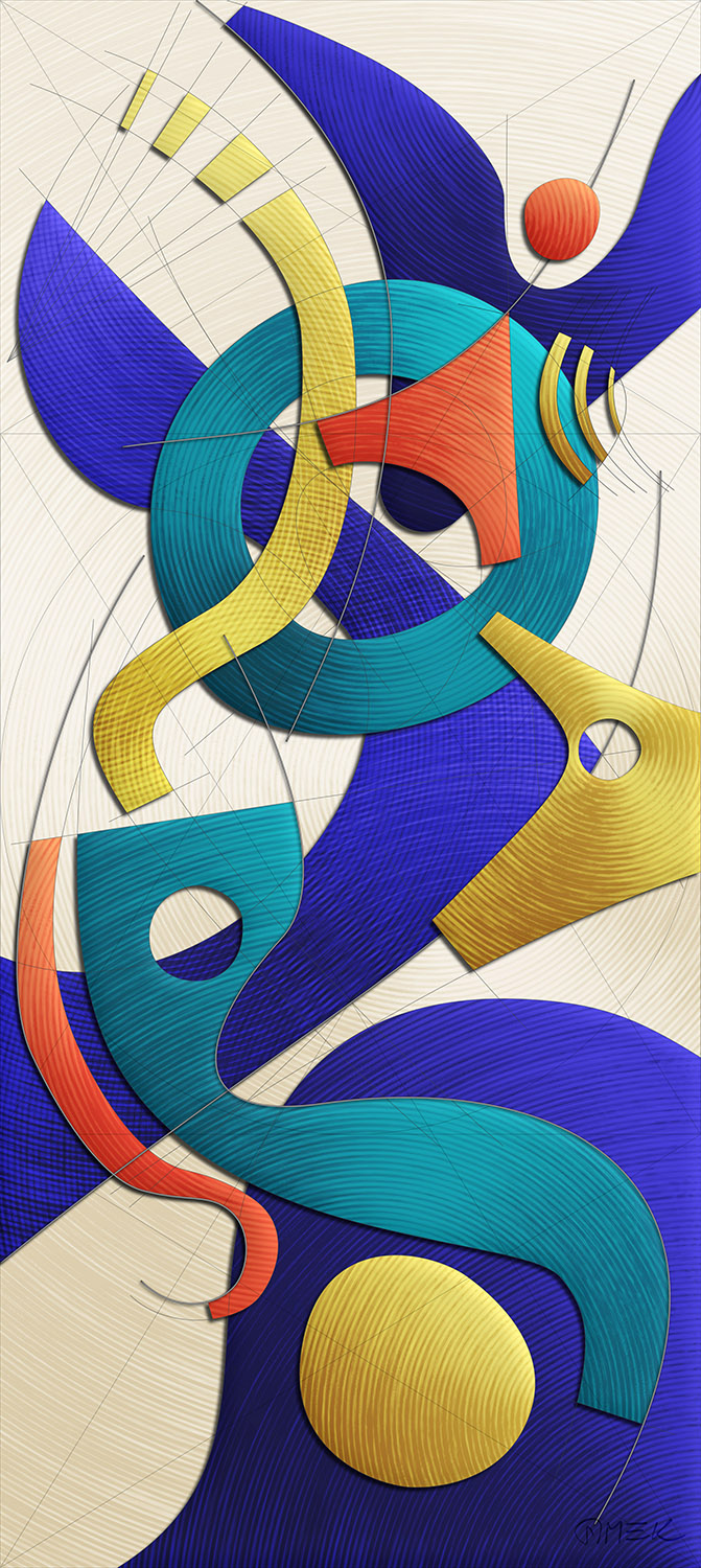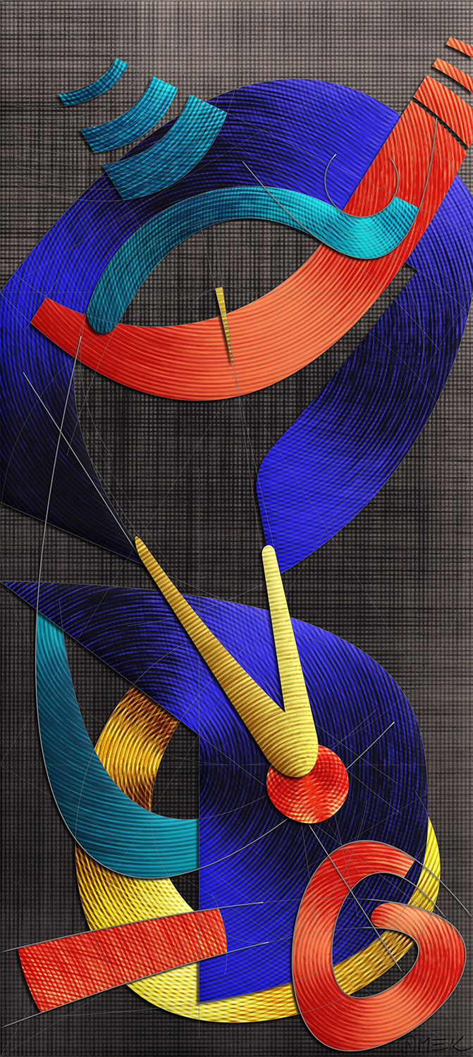 The construction was created in 3D and vector programs, based on digital paint sketches. An important element of the finalization consists of the textures and colors used. The objects are often more interwoven than in previous works.
